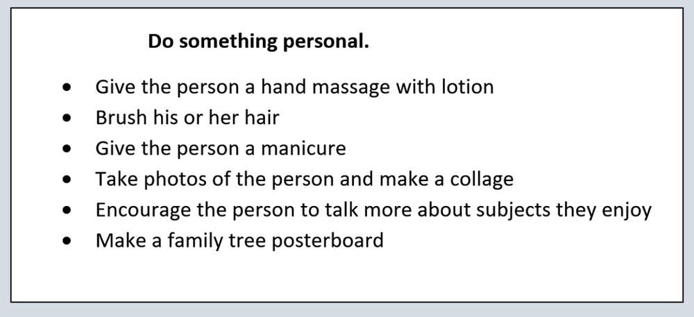 Personal Activities you can offer when working with a client or patient with Dementia. What do they like to do? What are they able to do? What are they in the mood for today? Read through list below and then print the complete list at the end of this module.